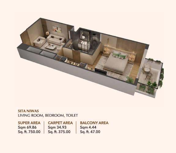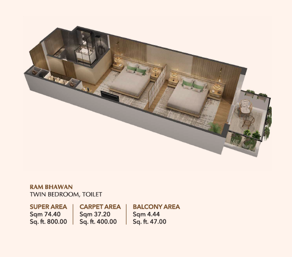 800 sq. ft. Studio Apartment – Offering a slightly larger layout, the 800 sq. ft. units are perfect for small families or individuals who prefer more space without sacrificing functionality. The open-plan design combines a living area, bedroom, and kitchen in a seamless flow..