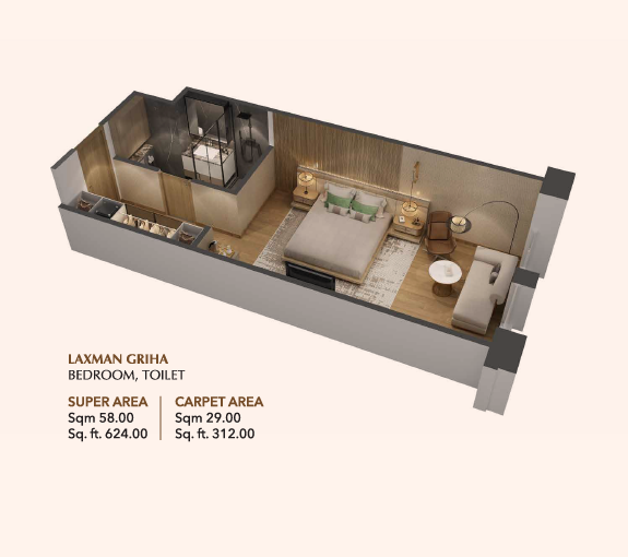 624 sq. ft. Studio Apartment – Designed with smart space utilization, the 624 sq. ft. apartments offer a comfortable living area, kitchen, and bathroom. Ideal for singles or couples, this unit maximizes comfort in a compact layout.